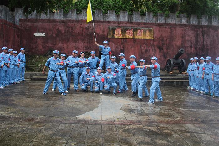 經(jīng)過(guò)一路爬涉,我們終于到達(dá)了紅七軍廣場(chǎng)。廣場(chǎng)足有兩個(gè)球場(chǎng)寬大,廣場(chǎng)的背景是一幅紅七軍的巨型浮雕,“鷹揚(yáng)關(guān)”三個(gè)大字蒼勁有力赫然其中,兩門古炮架設(shè)兩旁蔚為壯觀。據(jù)教官介紹,這里就是湘、桂、粵三省交界處,號(hào)稱“一腳踏三省”的地方。遙想當(dāng)年,紅七軍就是在這里集結(jié)從廣西進(jìn)入廣東連山。