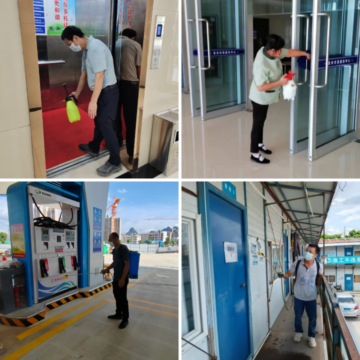 消殺人員全面對集團(tuán)辦公區(qū)域樓道、會議室、衛(wèi)生間等部位進(jìn)行環(huán)境消殺,對辦公室門把窗鎖、電腦鍵盤鼠標(biāo)、座椅扶手等頻繁接觸部位進(jìn)行清潔消毒;對物管小區(qū)大門、單元入戶門、小區(qū)綠化帶、樓梯通道、電梯轎廂、樓梯扶手、垃圾桶、信報箱等各公共區(qū)域進(jìn)行全面擦洗消毒,及時清運小區(qū)垃圾,清理衛(wèi)生死角;對平安立體停車庫、平安加油站、姑婆山小鎮(zhèn)路花新村項目、城東污水處理廠項目等開展防控消殺。僅一天時間,城投集團(tuán)共消殺辦公場所處,項目工地個,物管小區(qū)個,進(jìn)行了“無死角、無盲區(qū)、全覆蓋”的地毯式消毒作業(yè)。
