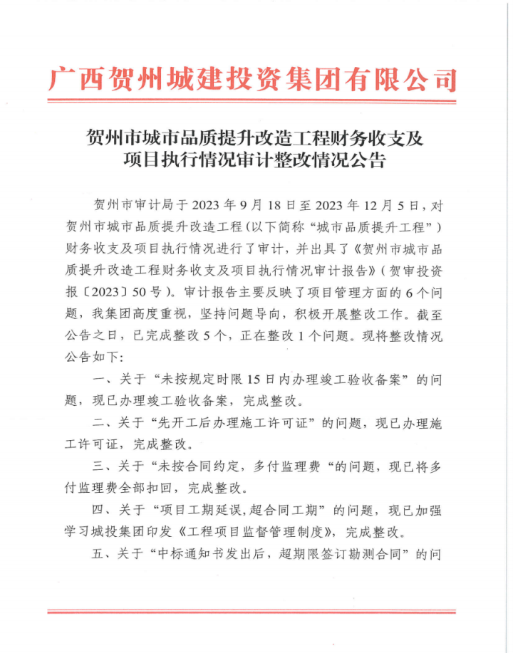 上一篇:廣西賀州城建投資集團(tuán)有限公司2022年度財務(wù)收支情況審計整改情況公告