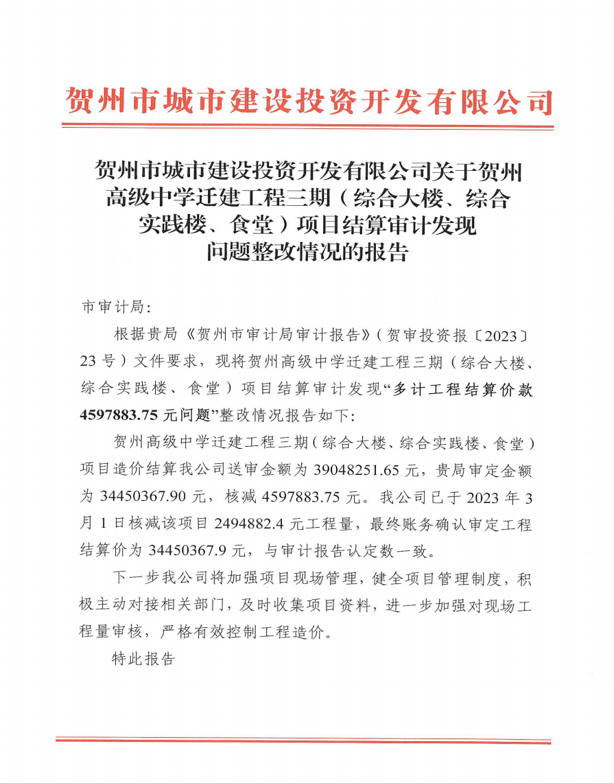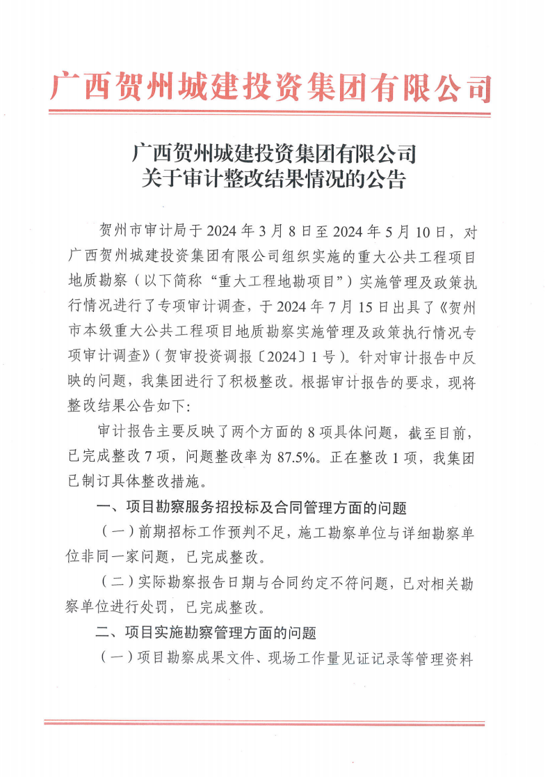 廣西賀州城建投資集團有限公司關(guān)于審計整改結(jié)果情況的公告2024-10-11