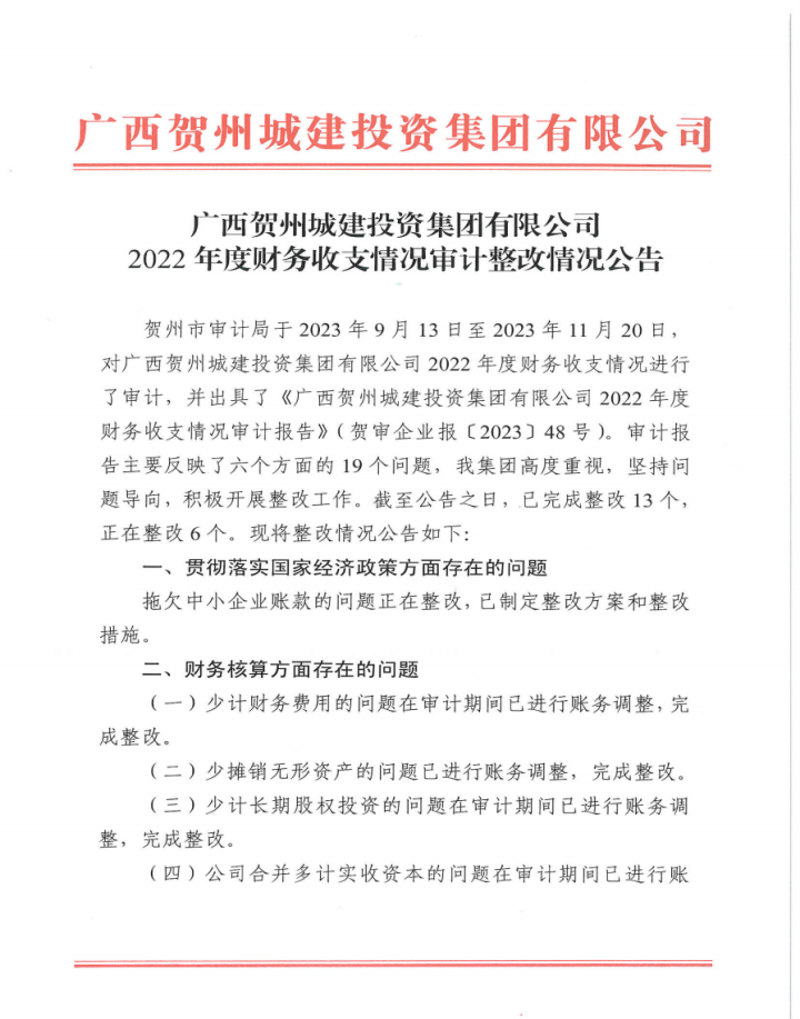 廣西賀州城建投資集團有限公司2022年度財務(wù)收支情況審計整改情況公告2024-03-27