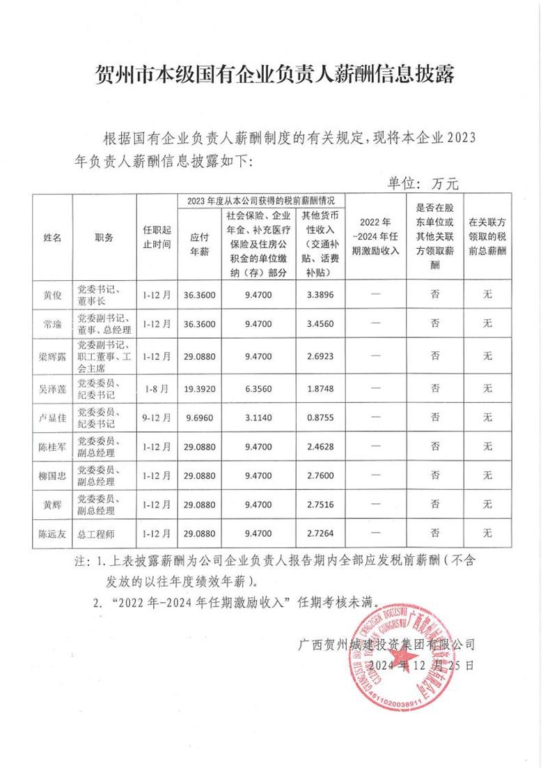 賀州市本級國有企業(yè)負責(zé)人薪酬信息披露2024-12-25